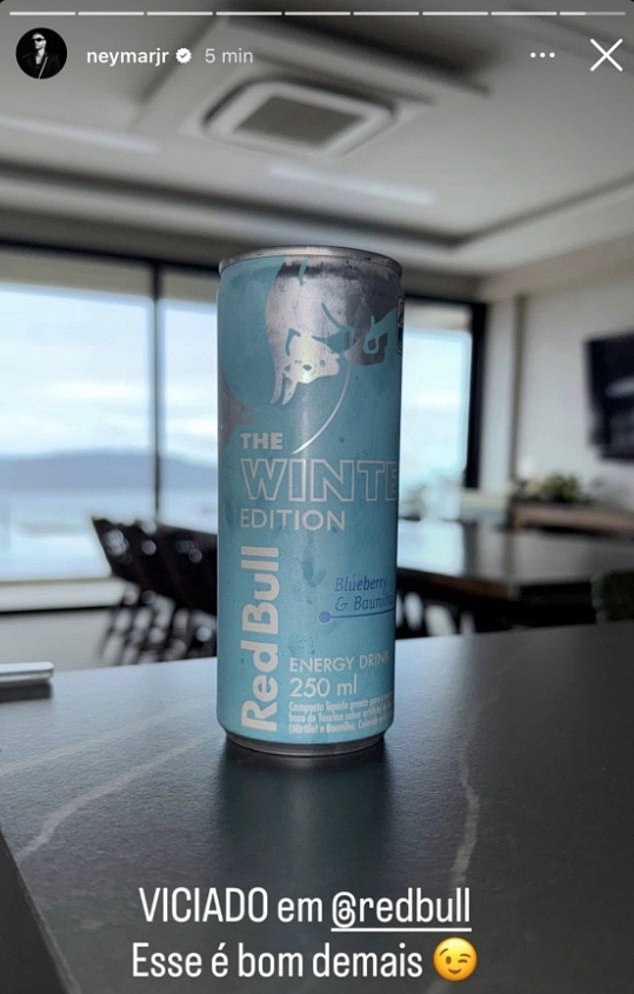 在他的社媒故事中,他分享了一张能量饮料罐的照片,配文写道:“对红牛上瘾。这个很棒”,并附上一个眨眼的表情符号。