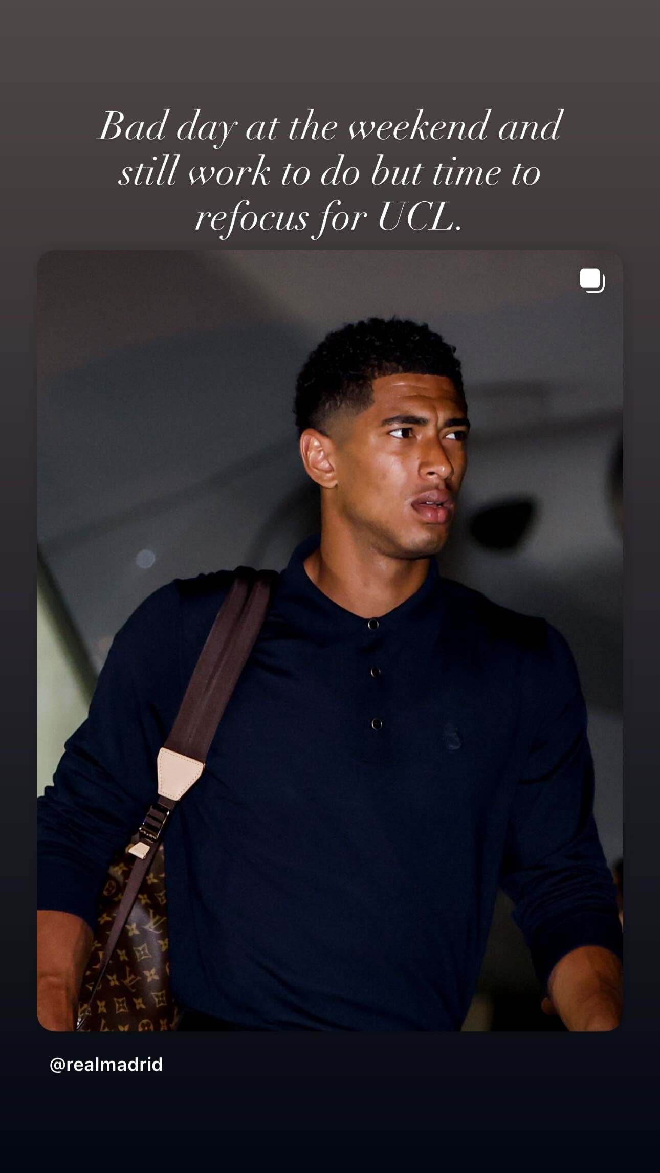 贝林厄姆在社交媒体写道:“这周末过得非常糟,不过我们还有工作要做,现在是时候重新集中精力备战欧冠联赛了。”