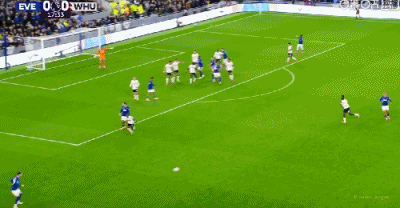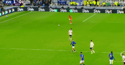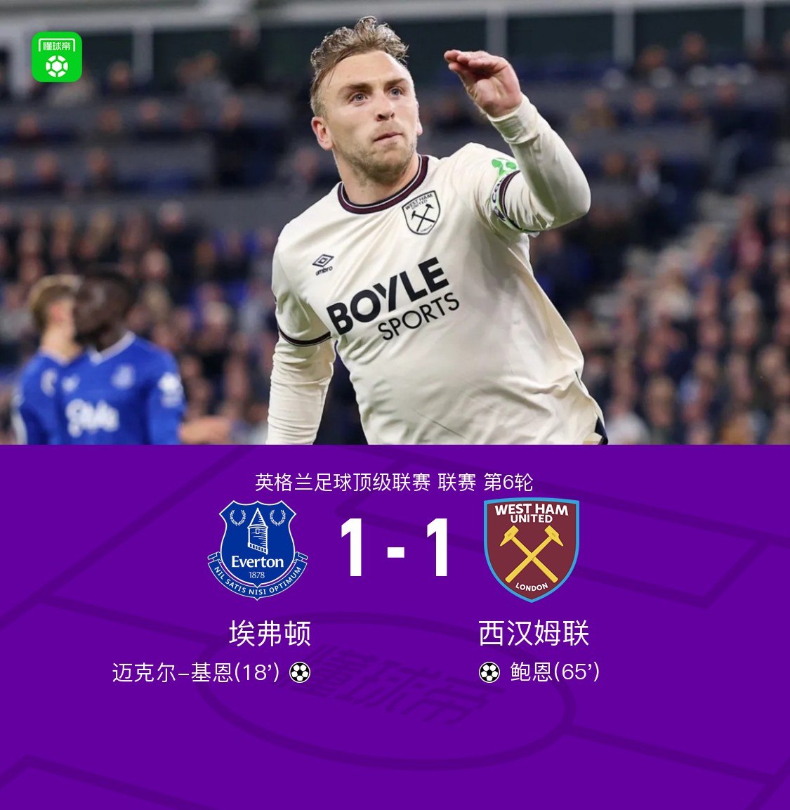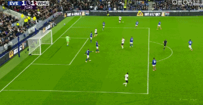 第65分钟,鲍恩禁区右路兜射远角破门,埃弗顿1-1西汉姆联