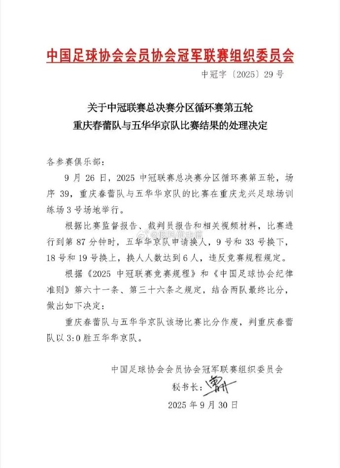 在9月26日进行的2025中冠总决赛分区循环赛第五轮,重庆春蕾1-3不敌五华华京。但在比赛第87分钟,五华华京连换两人,此时换人人数达到了6人,违反了竞赛规程规定。