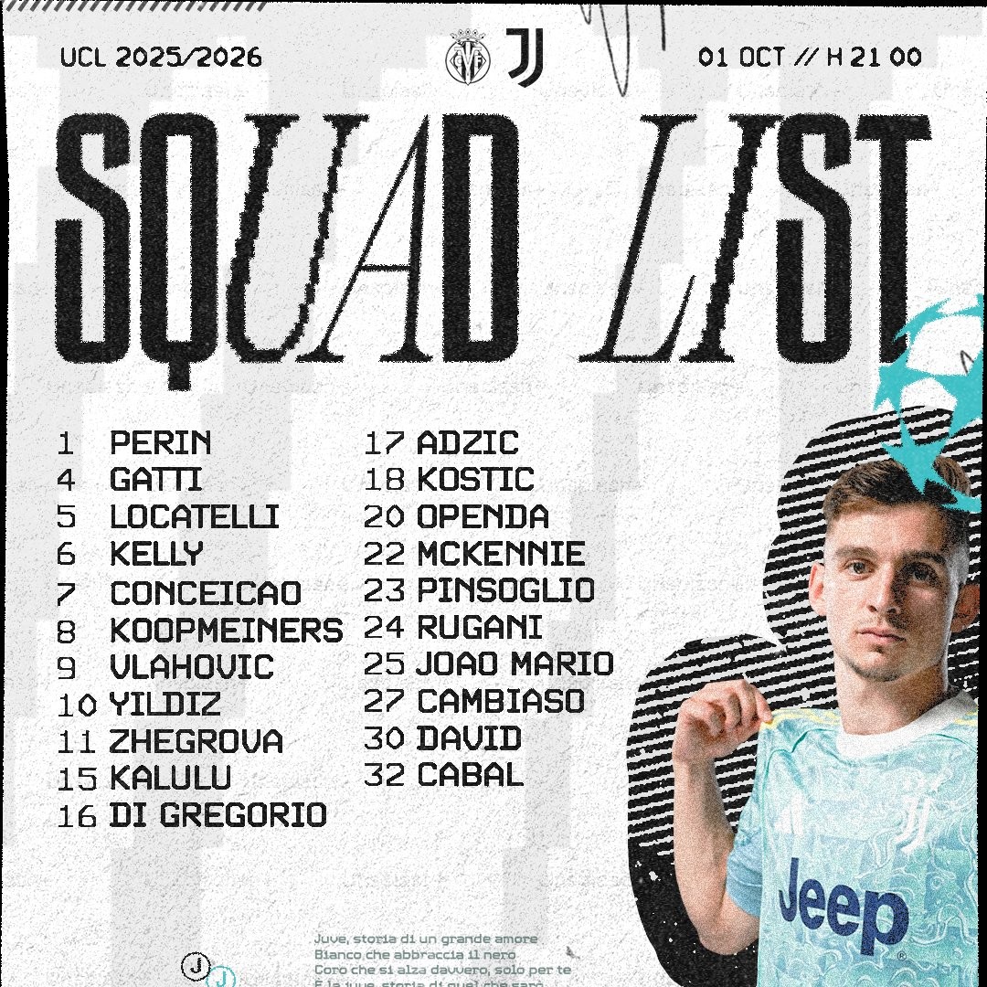 北京时间10月2日凌晨3点,尤文图斯将迎来欧冠联赛阶段第二轮客场对阵比利亚雷亚尔的比赛,赛前,尤文官方公布了本场比赛的大名单,其中伊尔迪兹、弗拉霍维奇在列,阿季奇、小孔塞桑入选;布雷默和图拉姆缺席。