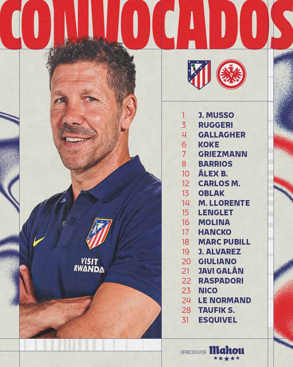 马德里竞技官方公布了欧冠主场对阵法兰克福的比赛大名单,格列兹曼领衔,阿尔瓦雷斯在列,阿尔马达缺席。