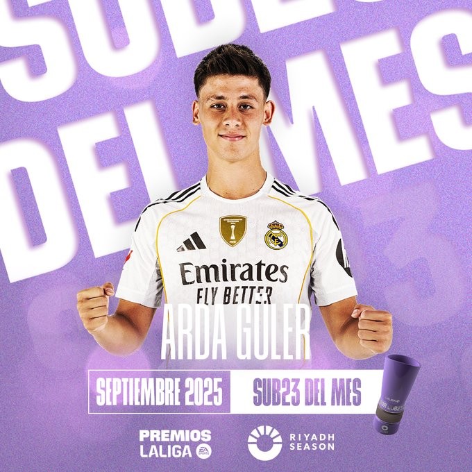 官方消息,皇马中场居莱尔当选西甲9月最佳U23球员。