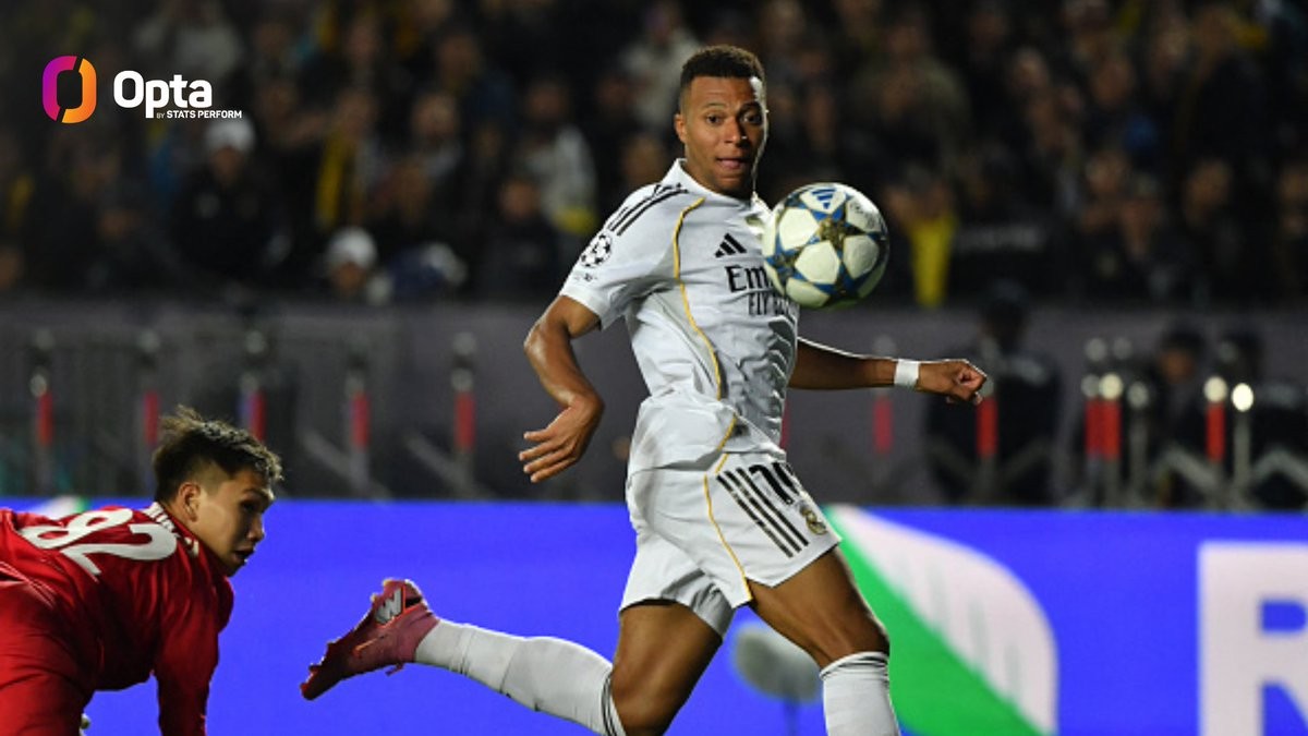 此役客场对阵阿拉木图凯拉特,姆巴佩打入三球,帮助皇家马德里5-0大胜对手。