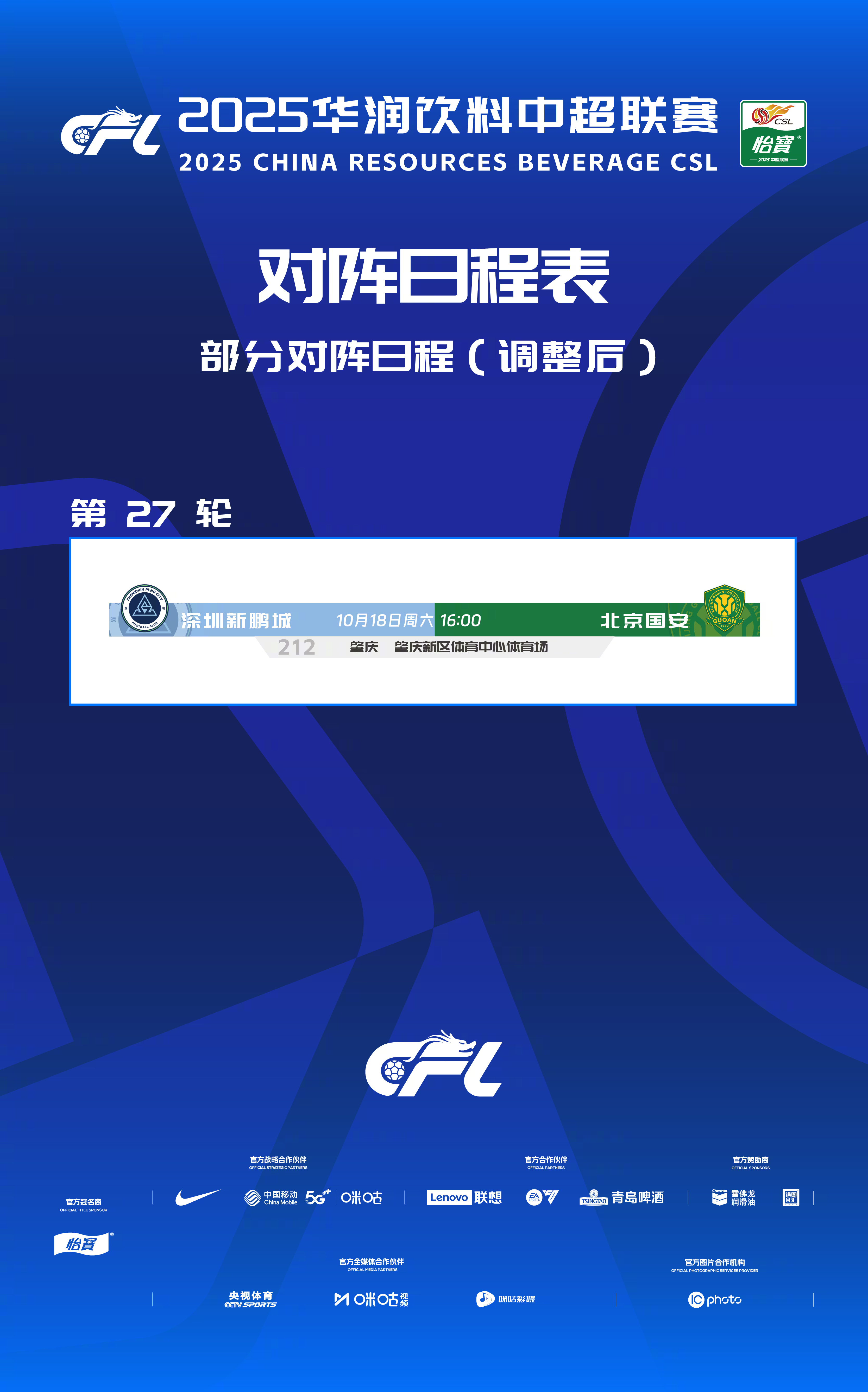 根据2025华润饮料中超联赛赛程,深圳新鹏城对阵北京国安的比赛将于10月17日20:00在深圳市体育中心体育场进行,因深圳赛区举办第十五届全运会足球男子U18比赛,为保证本场比赛安全有序进行。经深圳新鹏城足球俱乐部申请,协商深圳赛区、北京国安足球俱乐部以及有关方面同意,现决定将深圳新鹏城对阵北京国安比赛进行调整,具体调整如图。(完)