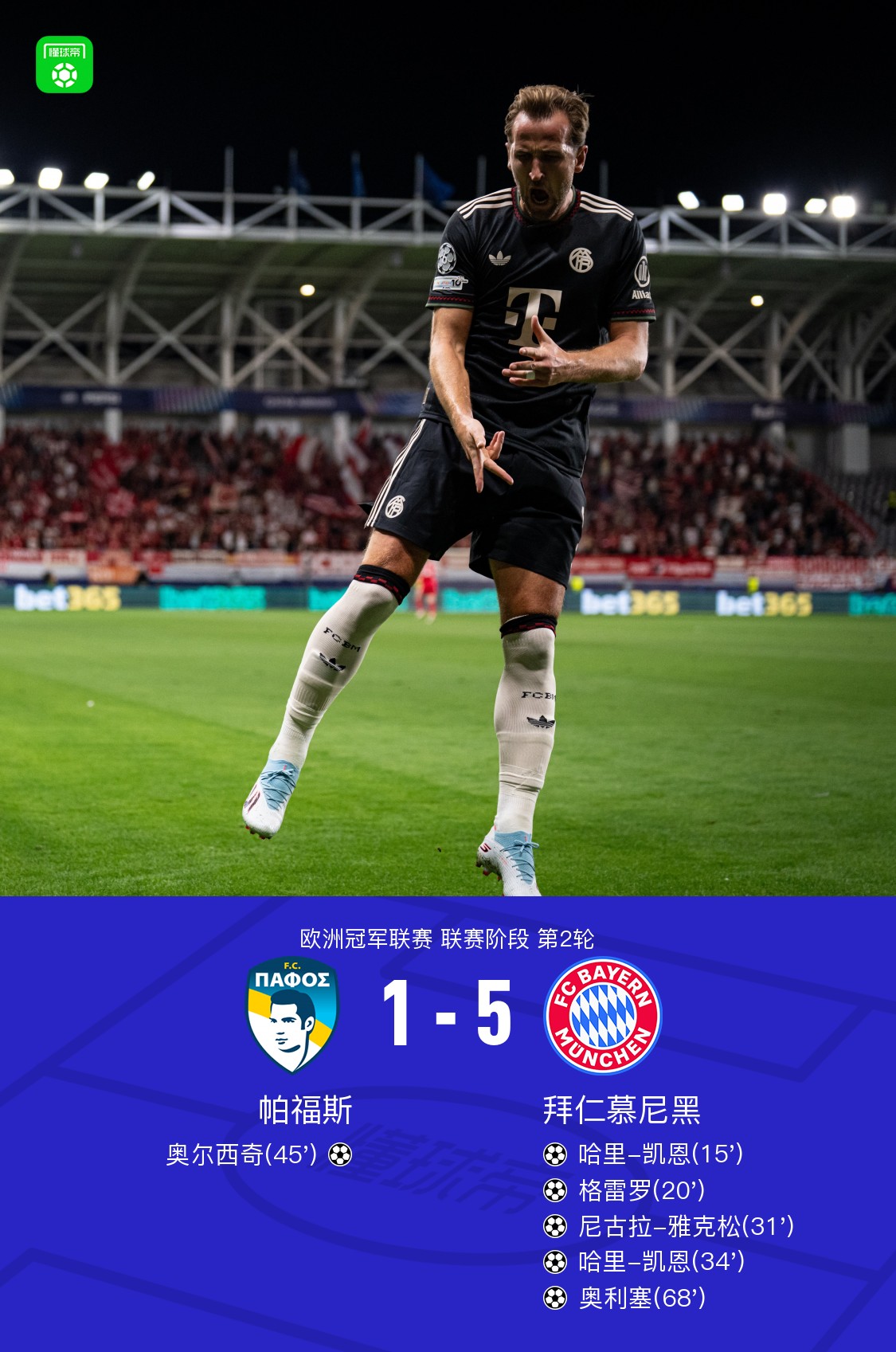 北京时间10月1日,欧洲冠军联赛联赛阶段第2轮展开较量,帕福斯迎战拜仁慕尼黑。比赛开始后,拜仁迅速掌控节奏,奥利塞送出助攻,哈里-凯恩接球后破门先拔头筹。随后不久,尼古拉-雅克松边路策动进攻,格雷罗包抄得手扩大比分。第31分钟,奥利塞再次送出精妙传球,尼古拉-雅克松冷静施射建功。第34分钟,哈里-凯恩再度破门,完成个人梅开二度,进一步巩固领先优势。