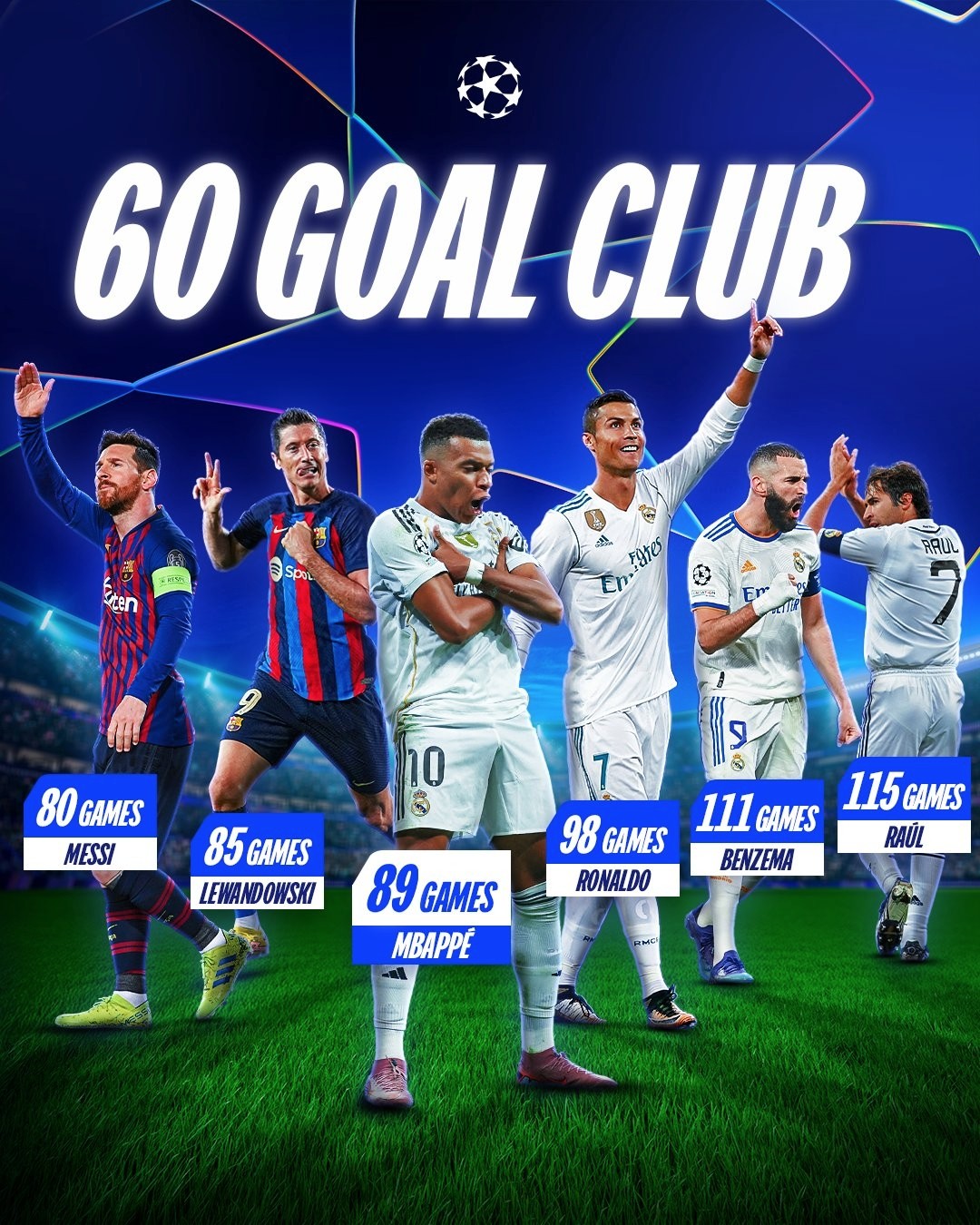 欧冠联赛阶段第2轮,姆巴佩面对凯拉特戴帽,以60粒进球独占欧冠历史射手榜第六位。在欧冠60球俱乐部里,姆巴佩用89场完成,速度历史第三。