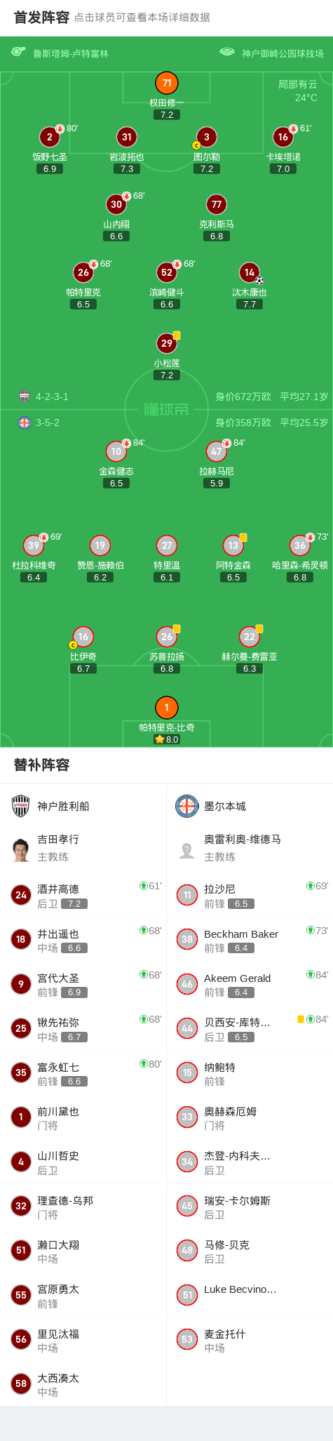 下半场补时第4分钟,神户胜利船球员汰木康也打入一球。
