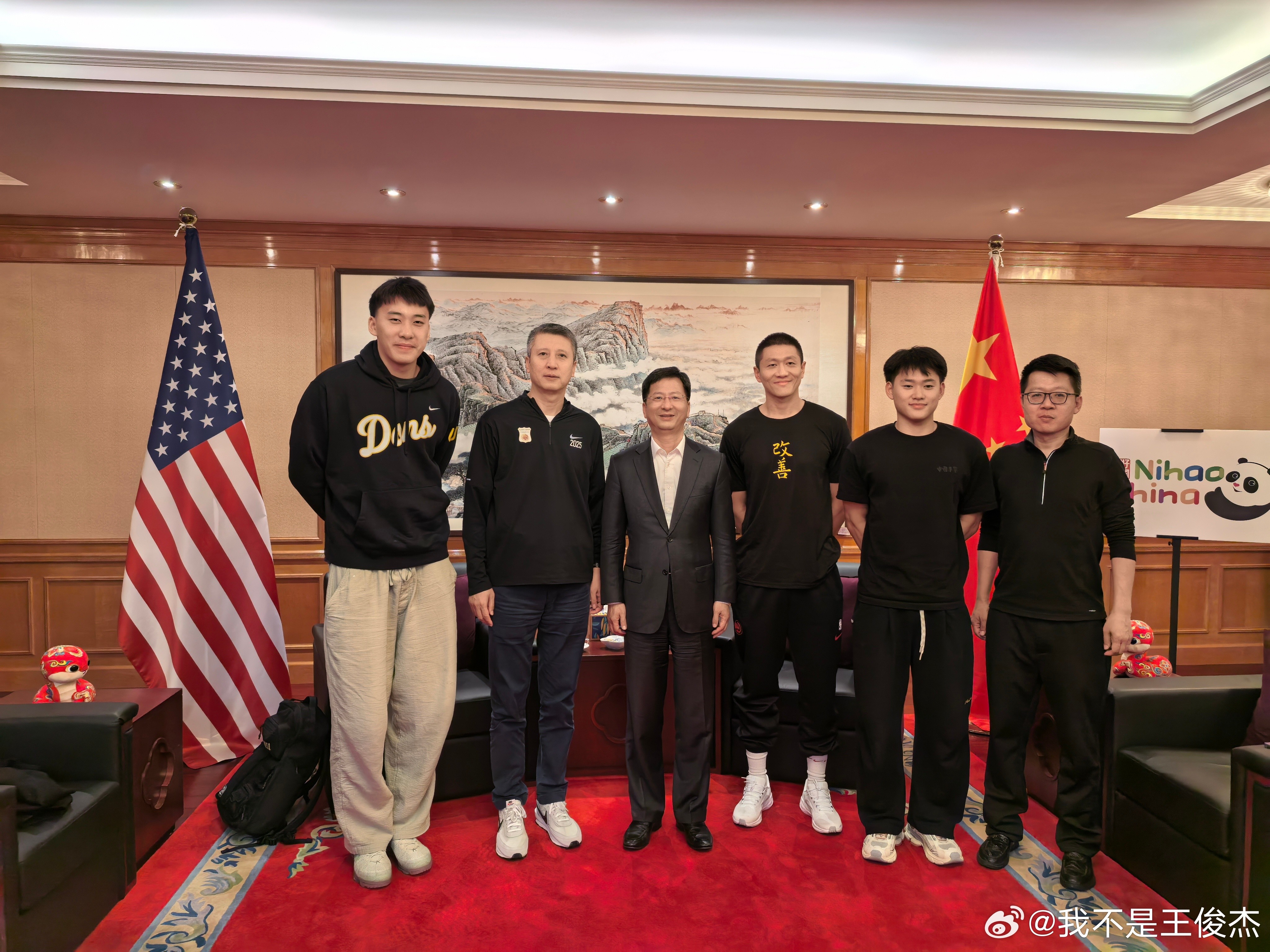 王俊杰晒出自己与郭士强、李昂的合照,同在旧金山大学效力的赵维伦一同入镜,王俊杰写道:“最近~感谢郭导和李导百忙之中来看望我们!”