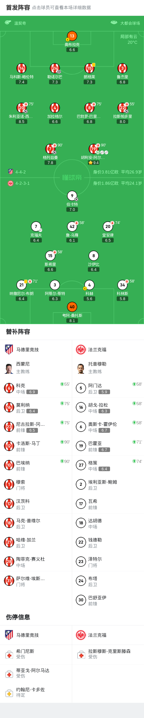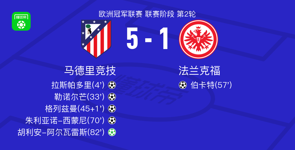 北京时间10月1日欧洲冠军联赛 联赛阶段 第2轮,马德里竞技对阵法兰克福。马德里竞技拉斯帕多里破门,勒诺尔芒破门,格列兹曼破门,朱利亚诺-西蒙尼破门,胡利安-阿尔瓦雷斯破门。法兰克福伯卡特破门。最终比分马竞 5–1 法兰克福。