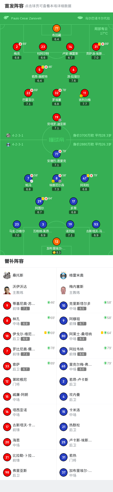 第56分钟,格雷米奥球员帕冯助攻埃德尼尔森打入一球。