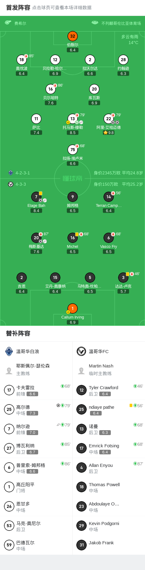 北京时间10月2日,加拿大冠军联盟决赛在温哥华白浪与温哥华FC之间展开。比赛伊始,托马斯-穆勒送出助攻,阿里-艾哈迈德接球后率先破门,为温哥华白浪取得领先。随后,托马斯-穆勒主罚点球命中,将比分进一步扩大。第35分钟,梅斯基达助攻Elage Bah推射得手,温哥华FC扳回一城。仅一分钟后,阿里-艾哈迈德再度破门,完成个人本场第二次进球。比赛进入尾声阶段,纳尔逊送出精准传球,高尔德冷静施射建功,帮助温哥华白浪巩固优势。终场前,Elage Bah突破后助攻梅斯基达破门,为温哥华FC再追一分。最终全场比赛结束,双方共打入六粒进球,温哥华白浪以4比2战胜对手,捧起冠军奖杯。