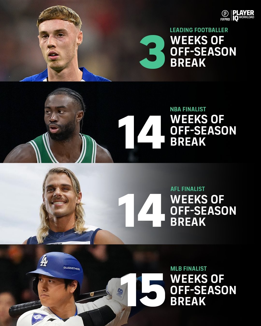 FIFPRO表示:“NBA(美国职业篮球联赛)、AFL(澳大利亚澳式足球联赛)和MLB(美国职业棒球大联盟)的球员能拥有14周甚至更长时间的休赛期。”