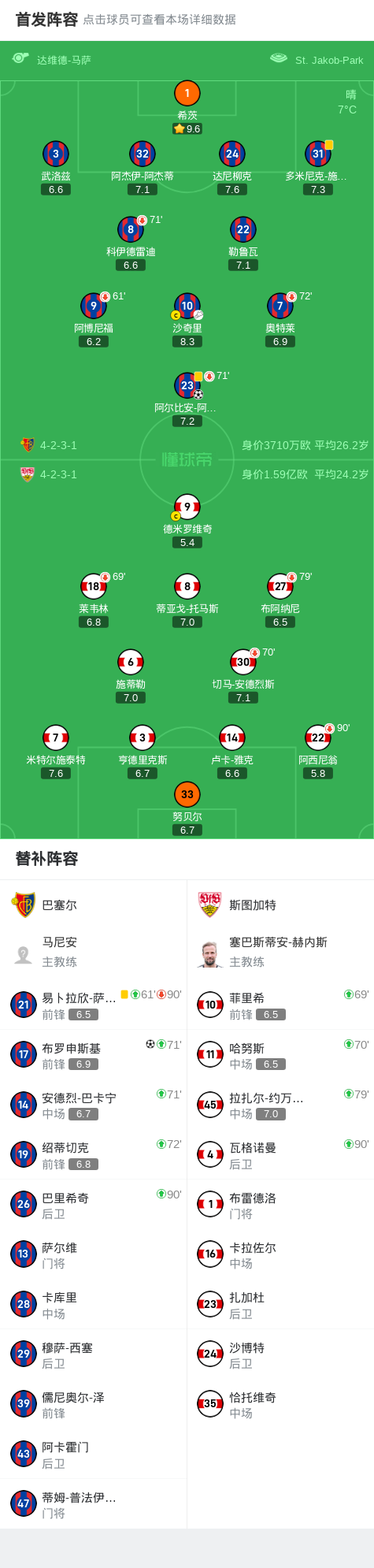北京时间10月3日欧足联欧洲联赛 联赛阶段 第2轮,巴塞尔对阵斯图加特。巴塞尔阿尔比安-阿耶蒂破门,布罗申斯基破门。最终比分巴塞尔 2–0 斯图加特。