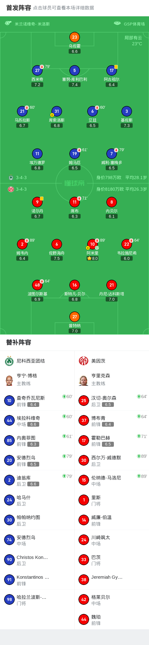 在欧洲协会联赛联赛阶段第1轮的一场较量中,尼科西亚团结迎战美因茨。比赛中,美因茨凭借阿米里主罚点球命中,攻入全场唯一进球。最终,比赛以尼科西亚团结 0-1 美因茨结束。 点击查看本场比赛详细数据>> 点击查看欧协联完整积分榜>> 精彩瞬间 第75分钟,美因茨球员阿米里罚入点球。 球队阵容 技术统计 文章导航 罗马0-1里尔,里尔门将厄泽尔三连扑点,哈拉尔德松制胜 巴尔德吉:为巴萨踢球是我从小以来的梦想;现在想赢得所有冠军