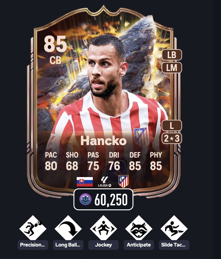 基石汉茨科:银精准头球、长传、螃蟹步、狐狸、滑铲,造价约6万金币。