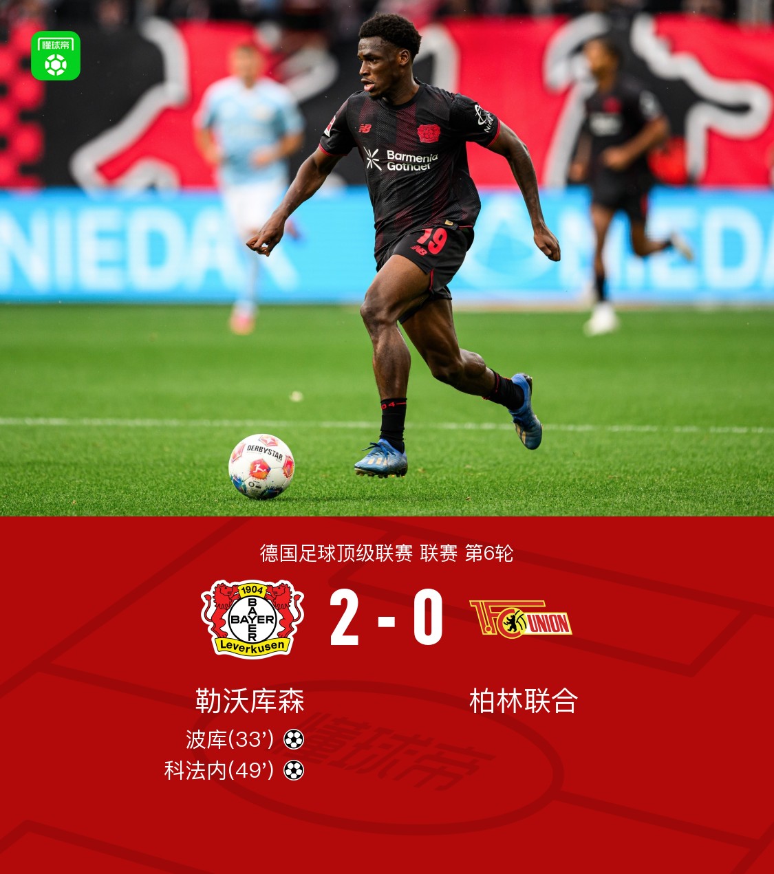 北京时间10月4日,德国足球甲级联赛第6轮展开较量,勒沃库森坐镇主场迎战柏林联合。比赛中,巴斯克斯送出精准助攻,波库接球后冷静施射破门,为勒沃库森先拔头筹。易边再战,科法内抓住机会攻入一球,进一步扩大领先优势。最终,勒沃库森以2-0战胜柏林联合,全取三分。