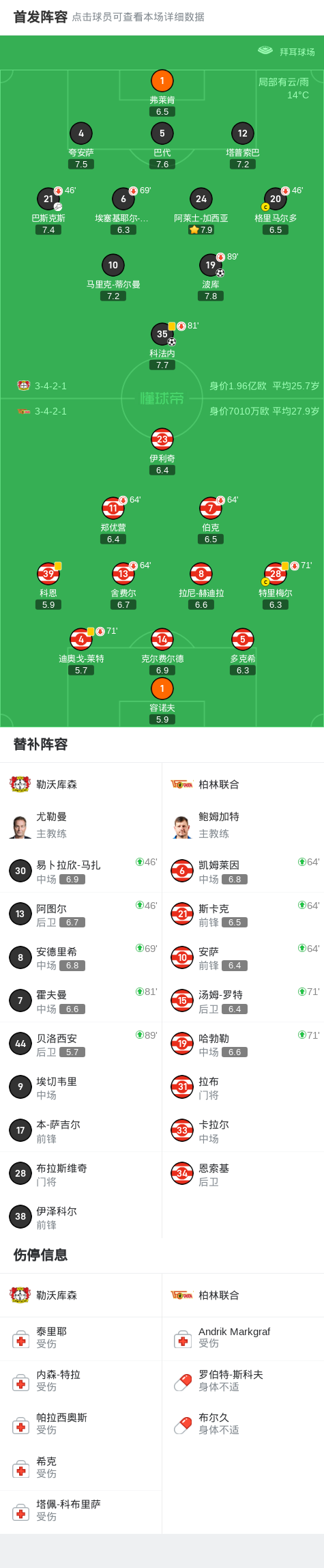 第33分钟,勒沃库森精彩反击,巴斯克斯助攻波库破门,1-0!