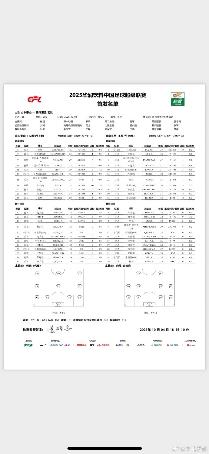 北京时间10月4日19:35,中超第26轮,山东泰山主场迎战云南玉昆,赛前双方公布了本场比赛的首发阵容: