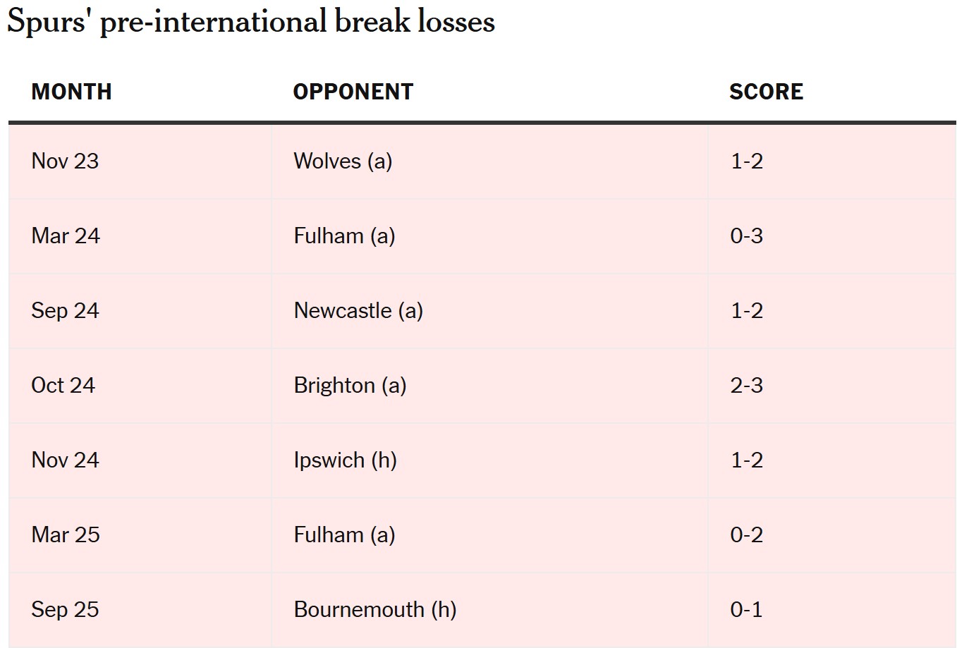 这段怪异纪录中,不乏让人费解的比赛。例如2024年2月,热刺在战胜水晶宫和阿斯顿维拉后,却客场0-3完败富勒姆,这是波斯特科格鲁任下球队首次联赛零进球。2024年10月对布莱顿的比赛,热刺上半场2-0领先,却在下半场崩盘,最终2-3落败。最令人难以接受的则是2024年11月主场1-2输给升班马伊普斯维奇,几乎全主力出战却依旧失手。