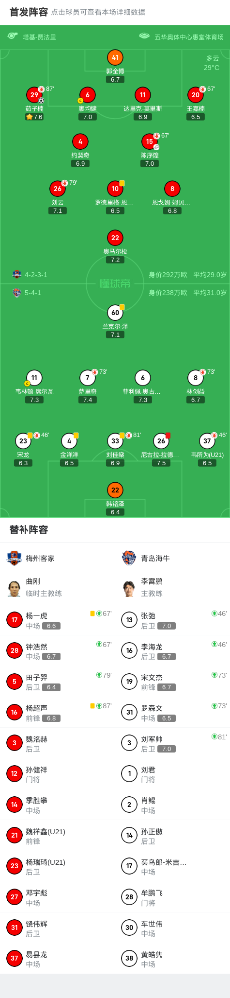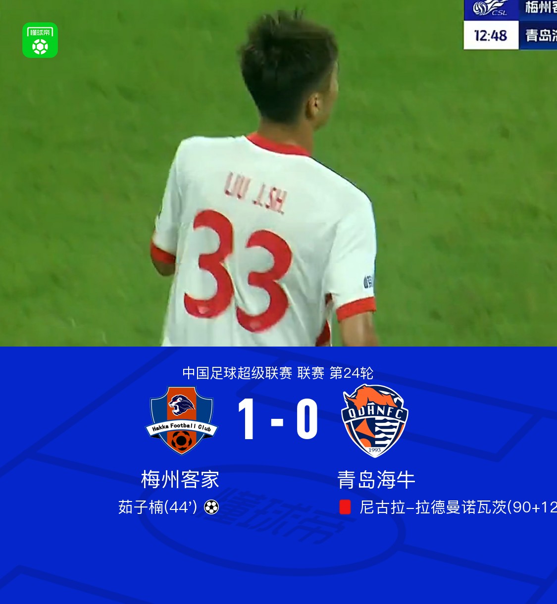 北京时间10月4日,2023赛季中国足球超级联赛第24轮展开较量,梅州客家坐镇主场迎战青岛海牛。比赛中,陈序煌送出精准助攻,茹子楠冷静破门,为球队打入制胜一球。下半场补时阶段,青岛海牛球员尼古拉-拉德曼诺瓦茨累计犯规被红牌罚下。最终,梅州客家以1比0战胜青岛海牛,全取三分。