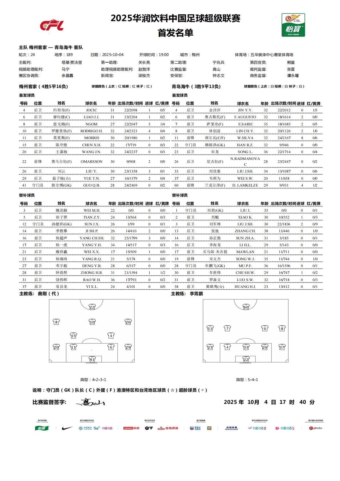 北京时间10月4日19:00,中超第24轮的一场较量。梅州客家坐镇主场,迎战青岛海牛。赛前,双方的阵容公布如下:
