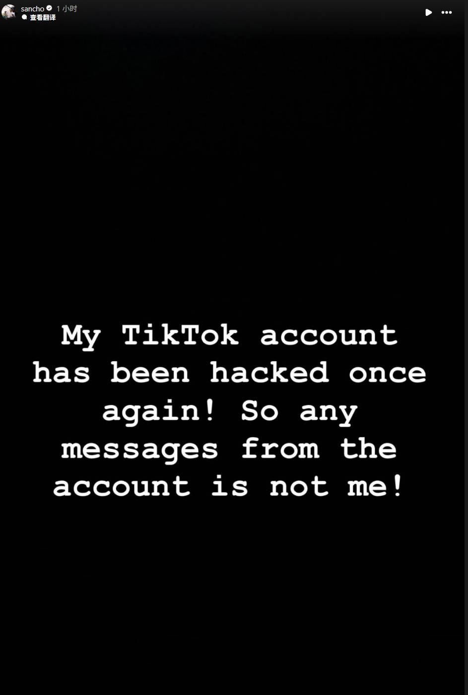 桑乔在社交上写道:“我的短视频平台账号又一次被盗了!所以任何来自该账号的消息都不是我本人发的!”