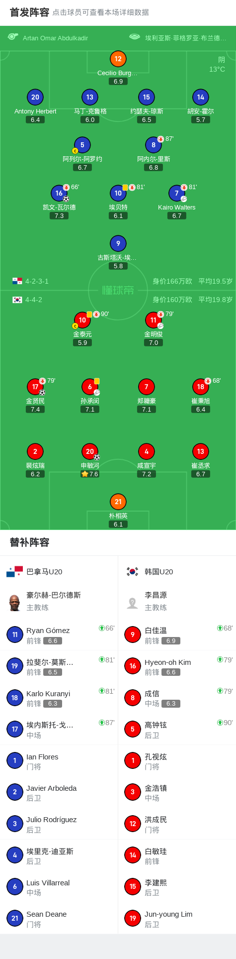 北京时间10月4日U20世界杯 小组赛 第3轮,巴拿马U20对阵韩国U20。巴拿马U20凯文-瓦尔德破门。韩国U20金贤民破门,申敏河破门。最终比分巴拿马U20 1–2 韩国U20。