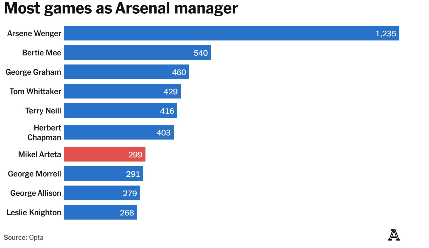 在阿森纳历任主帅执教时长排行榜上,阿尔特塔目前位列第七。不难想象他的排名还能再上升几位。再给他几年时间,他将接近超越俱乐部的标志性主帅赫伯特-查普曼,后者的雕像就矗立在俱乐部体育场著名的大钟下。