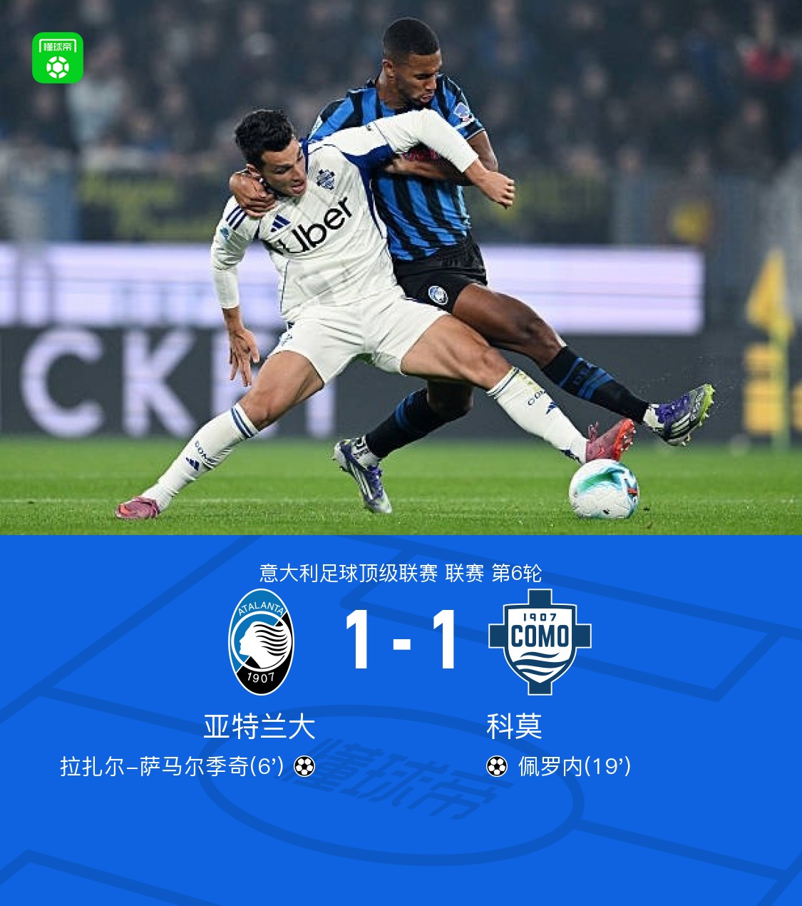 北京时间10月5日,意大利足球顶级联赛第6轮展开角逐,亚特兰大坐镇主场迎战科莫。比赛开始后,亚特兰大率先打破僵局,拉扎尔-萨马尔季奇接应进攻完成破门,为主队取得领先。此后科莫加强攻势,并由佩罗内抓住机会扳平比分,成功将比分改写。双方均未能再度改写记分牌,最终全场结束,亚特兰大与科莫以1比1握手言和。
