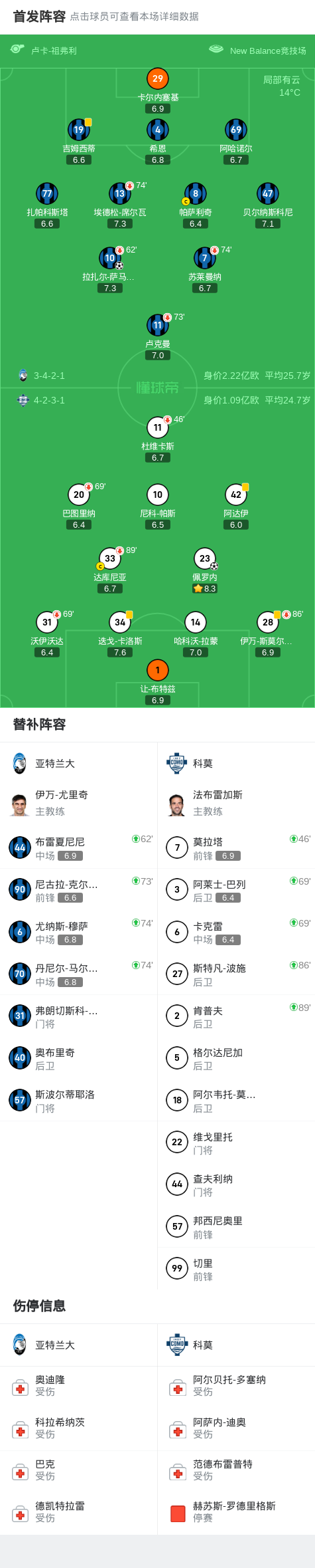 第6分钟,先拔头筹,萨马尔季奇低射破门,亚特兰大1-0