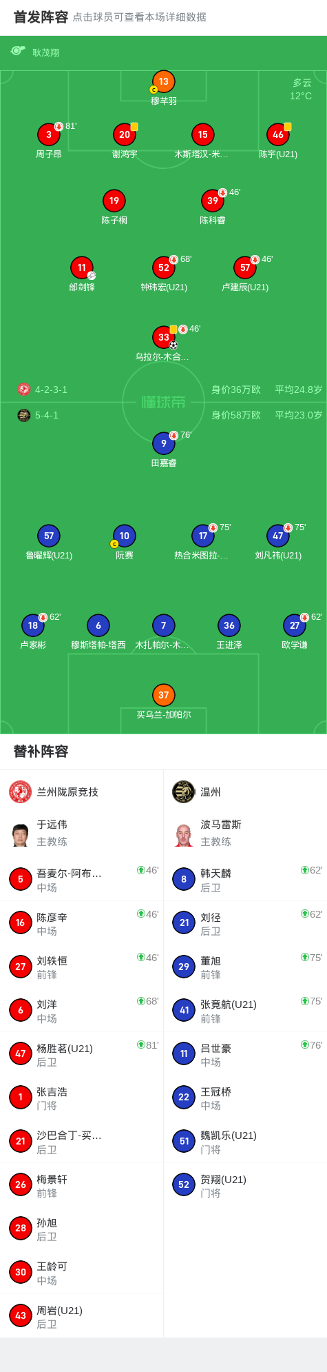 第45分钟,乌拉尔门前铲射破门,兰州半场结束前1-0领先温州
