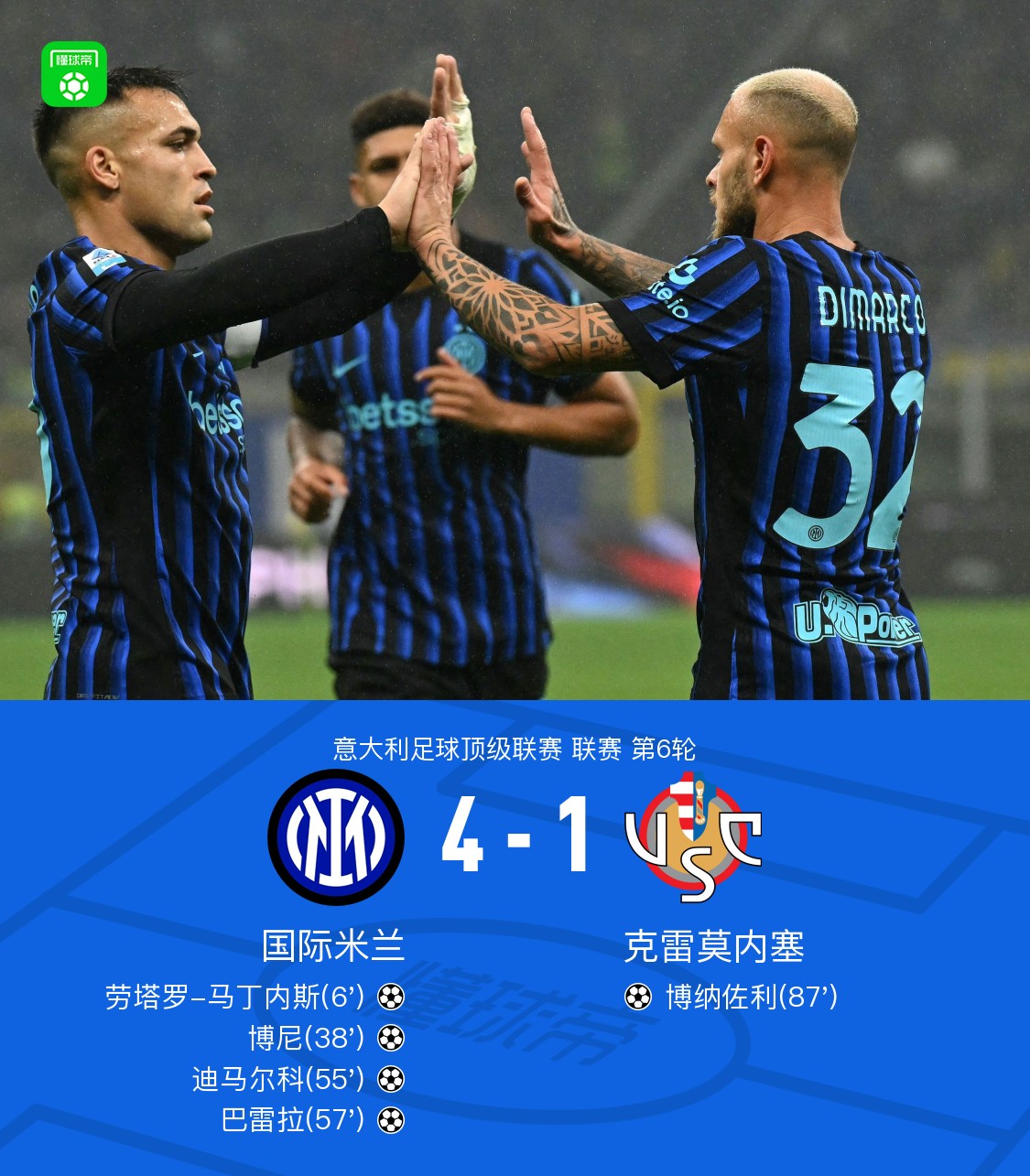 北京时间10月5日,意大利足球顶级联赛第6轮,国际米兰坐镇主场迎战克雷莫内塞。比赛开始后,国际米兰迅速掌控节奏,率先取得进球,劳塔罗-马丁内斯接博尼助攻破门,为主队打开局面。此后国际米兰持续施压,迪马尔科接博尼传球再下一城,进一步扩大领先优势。易边再战,博尼再度展现进攻组织能力,先后助攻迪马尔科和巴雷拉接连得分,将比分拉开。临近尾声,克雷莫内塞由博纳佐利接凡德佩特助攻扳回一球,但未能改变局势。最终全场比赛结束,国际米兰以4比1战胜克雷莫内塞。