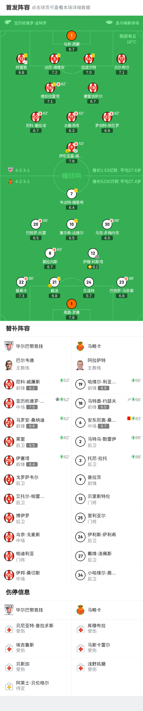 北京时间10月5日西班牙足球甲级联赛 联赛 第8轮,毕尔巴鄂竞技主场对阵马略卡。毕尔巴鄂竞技伊尼亚基-威廉斯破门,亚历杭德罗-雷戈破门。马略卡萨穆-科斯塔破门。最终比分毕尔巴鄂竞技 2–1 马略卡。