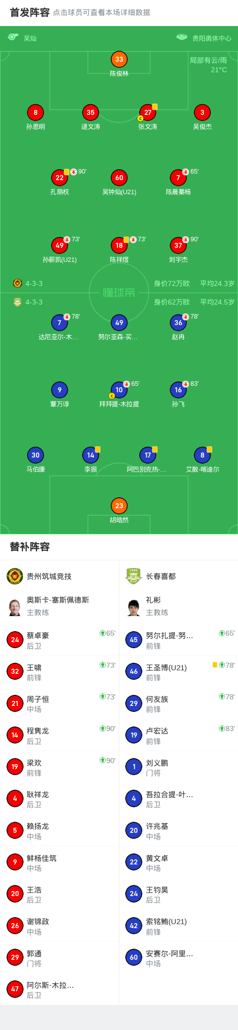 2023赛季中国足球协会乙级联赛决赛阶段争冠组第28轮,贵州筑城竞技坐镇主场迎战长春喜都。双方在整场较量中均展现出顽强的防守韧性和战术纪律,攻防转换节奏紧凑。比赛中,两队多次制造威胁进攻,但均未能把握住破门良机。贵州筑城竞技在前场连续配合制造压力,长春喜都则通过快速反击寻找机会,但双方射门均被对方化解。随着裁判员终场哨声响起,全场比分定格为0-0,两队各取一分。