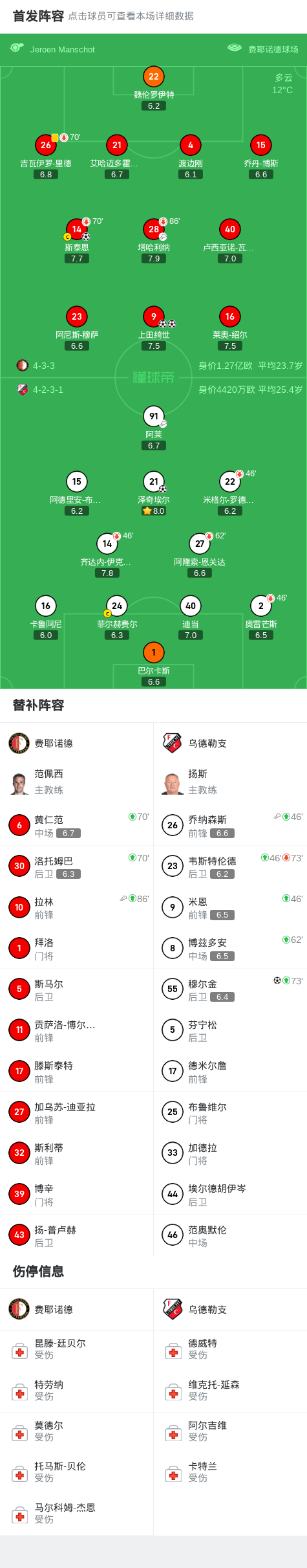 第88分钟,费耶诺德球员拉林助攻上田绮世打入一球。
