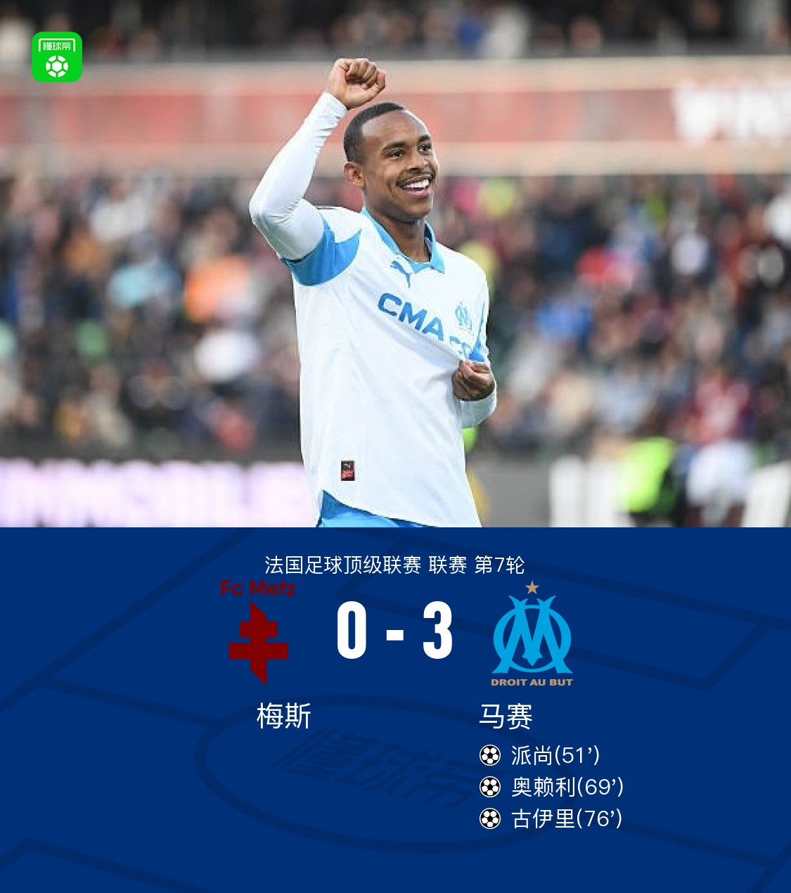 第76分钟,古伊里禁区推射破门,马赛3-0梅斯