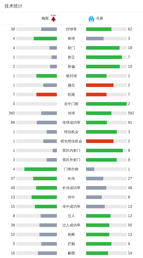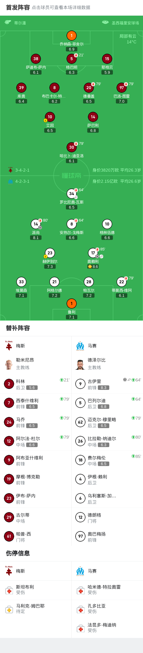 第53分钟,派尚禁区推射打门,皮球变线后弹进球门,马赛1-0梅斯