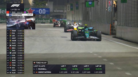 第五十九圈:换上软胎的塞恩斯冲击积分区最后的位置,汉密尔顿和安东内利争夺P5,诺里斯和维斯塔潘继续P2争夺。