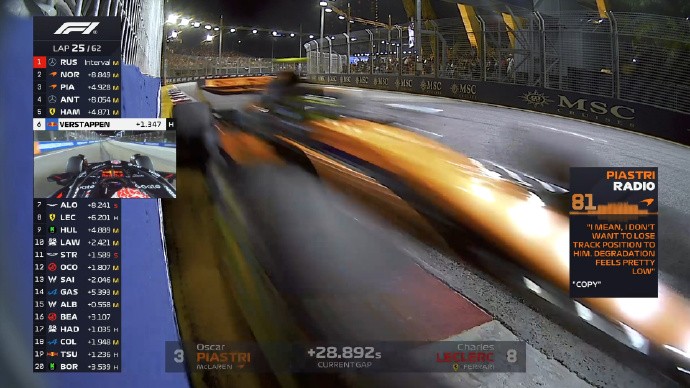 第二十五圈:皮亚斯特里告诉车队希望用这套中性胎继续跑,维斯塔潘追至汉密尔顿身后,法拉利车手进站