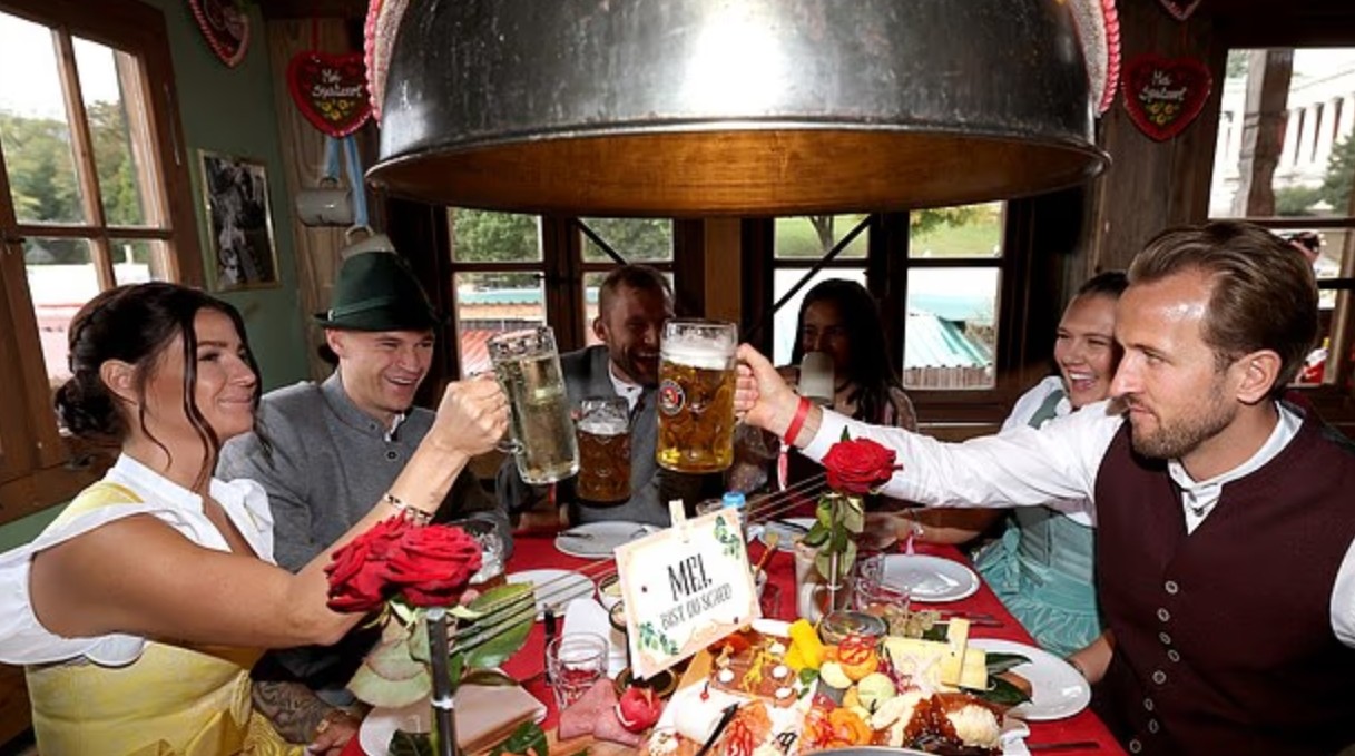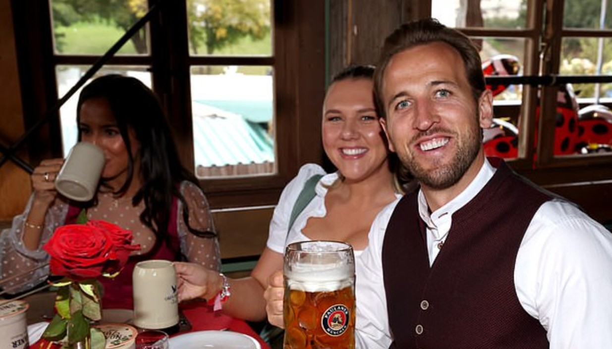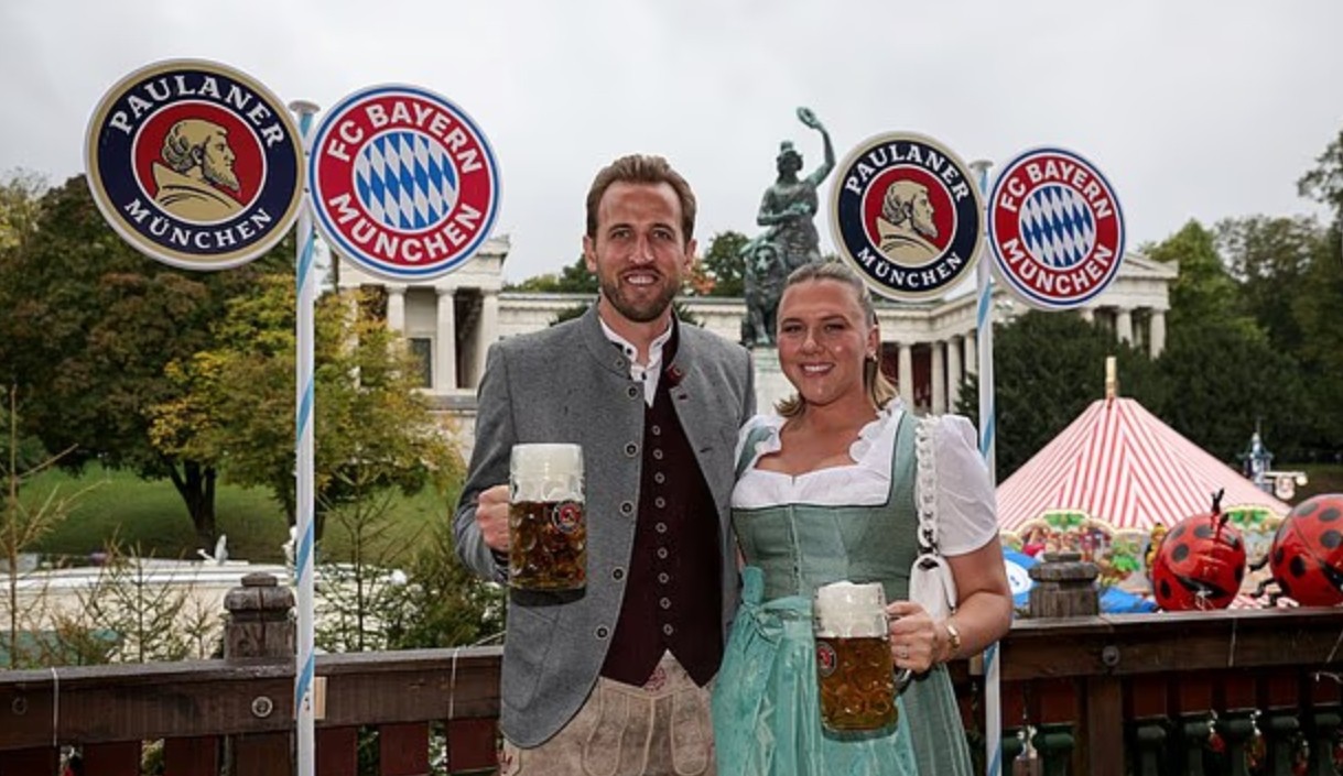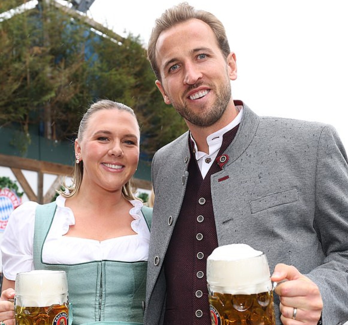 这位英格兰队长如今已经迎来在拜仁的第三个赛季,图片中他身穿巴伐利亚传统皮短裤(Lederhosen),手举大啤酒杯,尽显节日气氛。妻子凯特也一同出席,两人一同亮相,宛如节日现场的焦点。