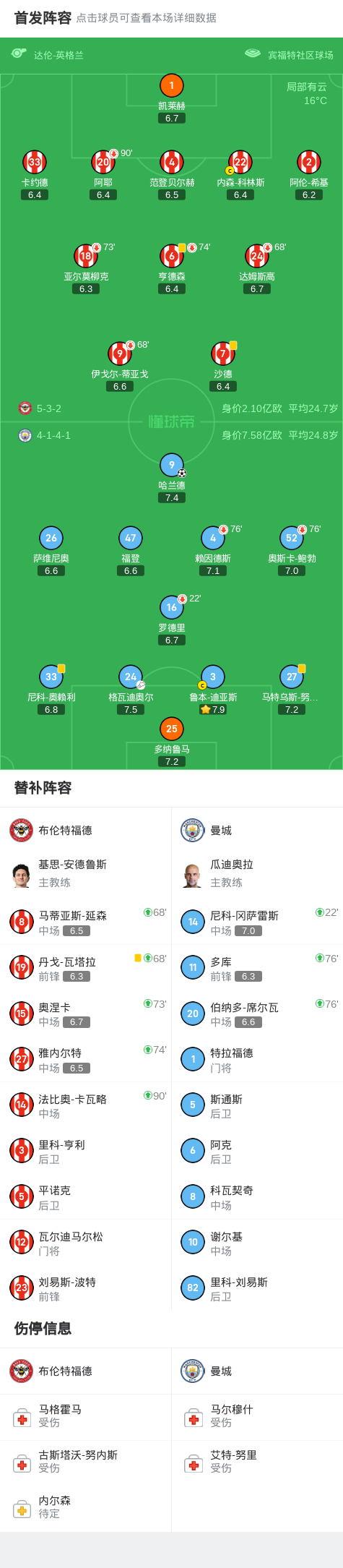 北京时间10月5日,英格兰足球超级联赛第7轮,布伦特福德坐镇主场迎战曼城。比赛开始后,曼城迅速掌控场上节奏。第9分钟,格瓦迪奥尔送出助攻,哈兰德冷静破门,为曼城取得领先。此后双方均未能改写比分,最终全场结束,布伦特福德0-1不敌曼城。