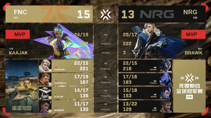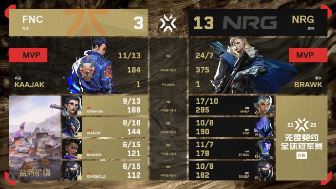 北京时间10月5日,2025年无畏契约巴黎全球冠军赛总决赛,NRG以总比分3-2击败FNC,拒绝让二追三夺得冠军!作为美洲区2号种子,NRG以黑马之姿一路过关斩将,不断展现他们强大的韧性,最终以不败战绩站在世界之巅。