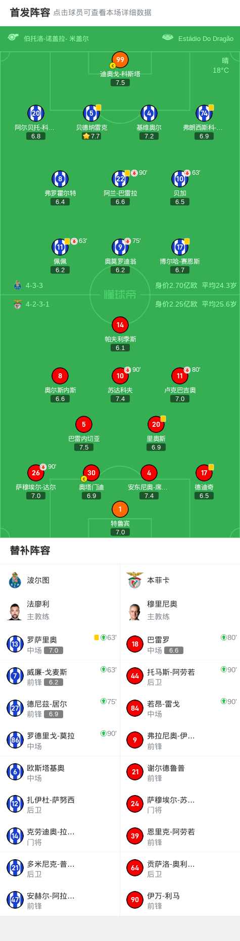 北京时间10月6日葡萄牙足球超级联赛 联赛 第8轮,波尔图主场对阵本菲卡。最终比分波尔图 0–0 本菲卡。
