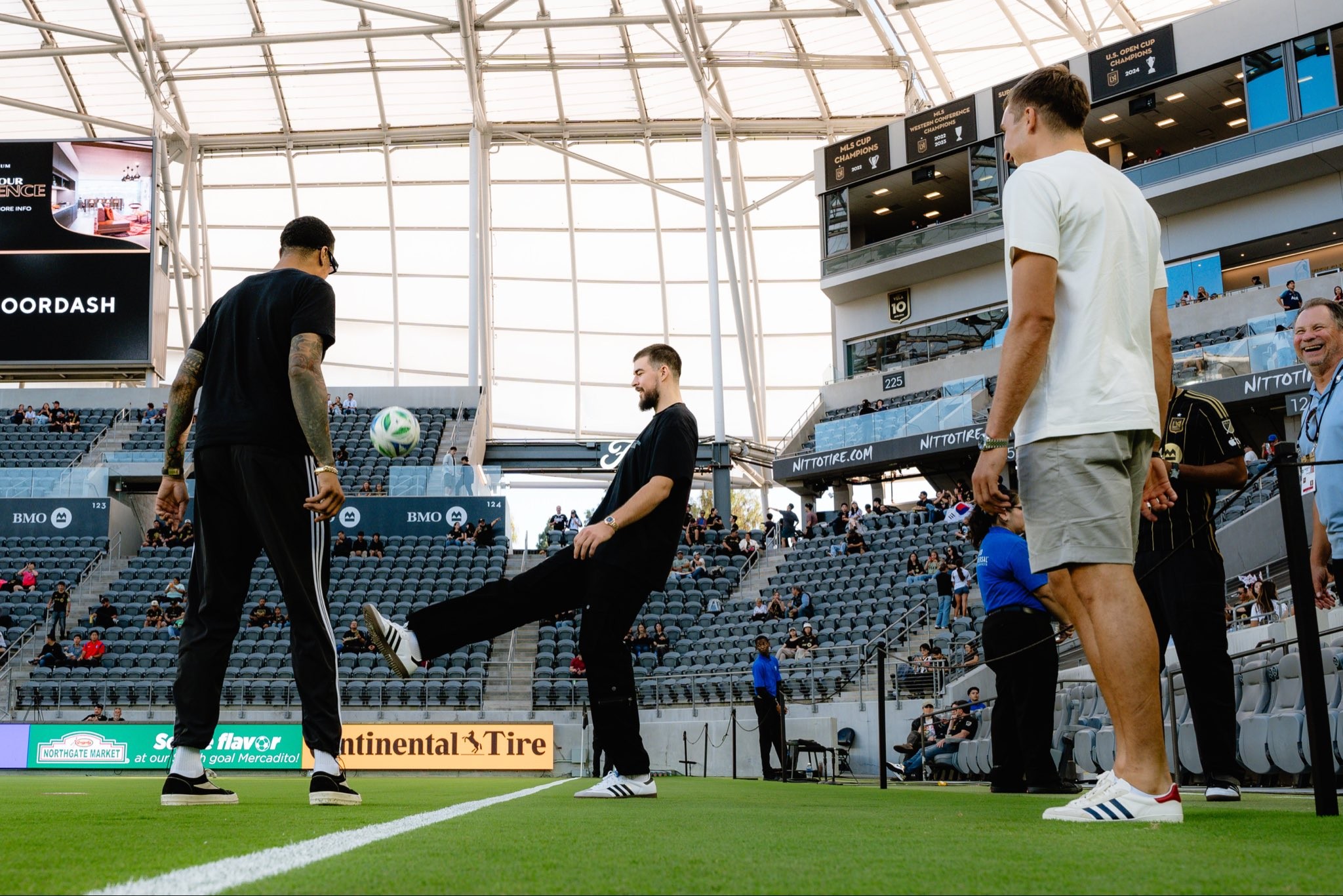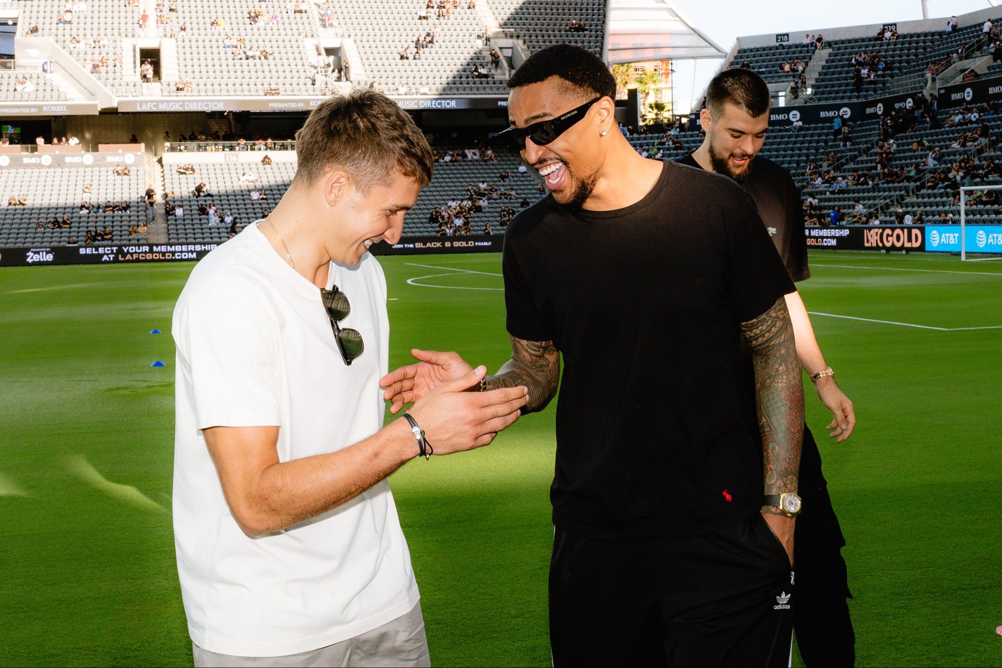 本场比赛,来自NBA的同城球队洛杉矶快船的祖巴茨、博格丹和约翰-科林斯三人来到现场观看比赛,赛前,来自克罗地亚的祖巴茨还展示了一下自己的脚法,赛后,三人代表快船队向孙兴慜赠送专属球衣。