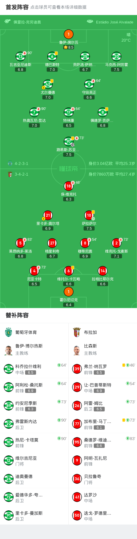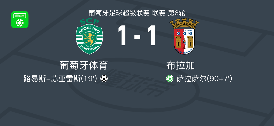 北京时间10月6日,葡萄牙足球超级联赛第8轮展开角逐,葡萄牙体育坐镇主场迎战布拉加。比赛中,葡萄牙体育率先打破僵局,路易斯-苏亚雷斯接队友传球后冷静施射得手,为主队取得领先。此后双方均未能扩大比分,比赛进入尾声阶段,布拉加获得点球机会,萨拉萨尔站上罚球点,沉着将球罚进,完成绝平。最终全场战罢,葡萄牙体育与布拉加以1比1握手言和。