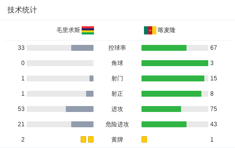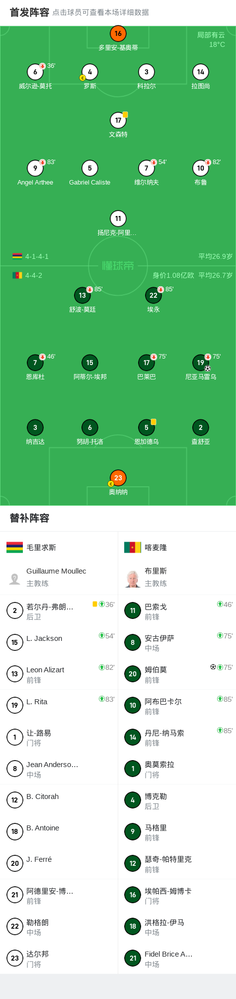 喀麦隆2-0毛里求斯,尼亚马雷乌建功,姆伯莫锦上添花