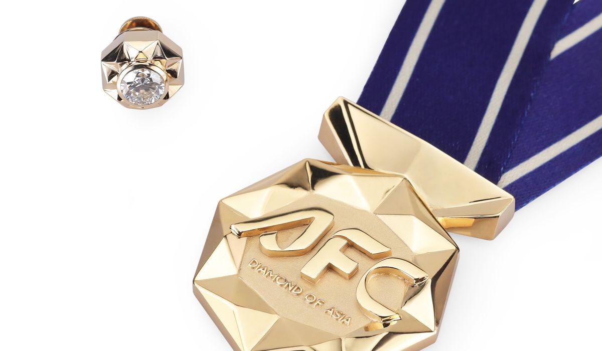 这款奖牌彰显卓越,并向亚洲丰富的文化遗产致敬。其整体形状为一枚风格化的八边形钻石,散发优雅气质,同时完美融合了全新的亚足联标志于其中心位置。奖牌由世界闻名的皇家雪兰莪打造,采用蓝金色丝带,展现其尊贵地位,并配有一枚精雕细琢的胸针。佩戴时尽显荣耀,奖牌延续了原有的多面金质设计,中心镶嵌一颗钻石——其切割角度经过精心设计,既能完美折射光线、吸引目光,又与胸针的整体设计和谐平衡。