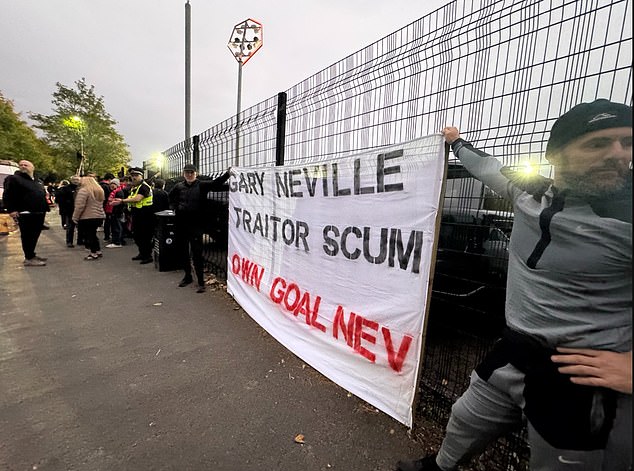 周二晚间,内维尔的旗舰酒店和足球俱乐部成为球迷的目标,他们举着横幅并将英国国旗系在附近的灯柱上。