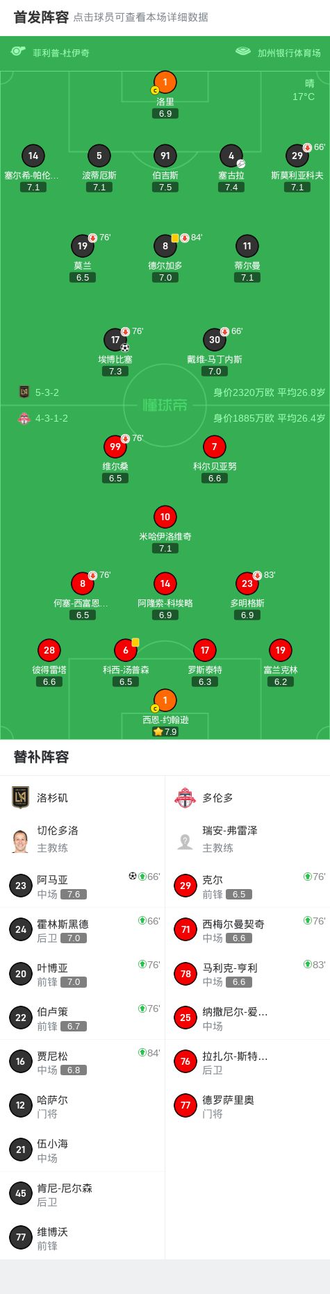 洛杉矶2-0多伦多取美职联6连胜,埃博比塞破门,阿马亚锁定胜局